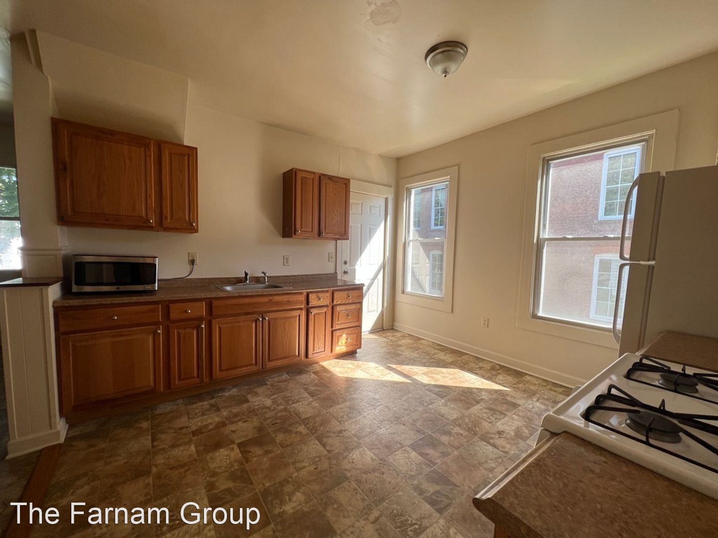 - Eat-in kitchen with gas stove, refrigerator and microwave