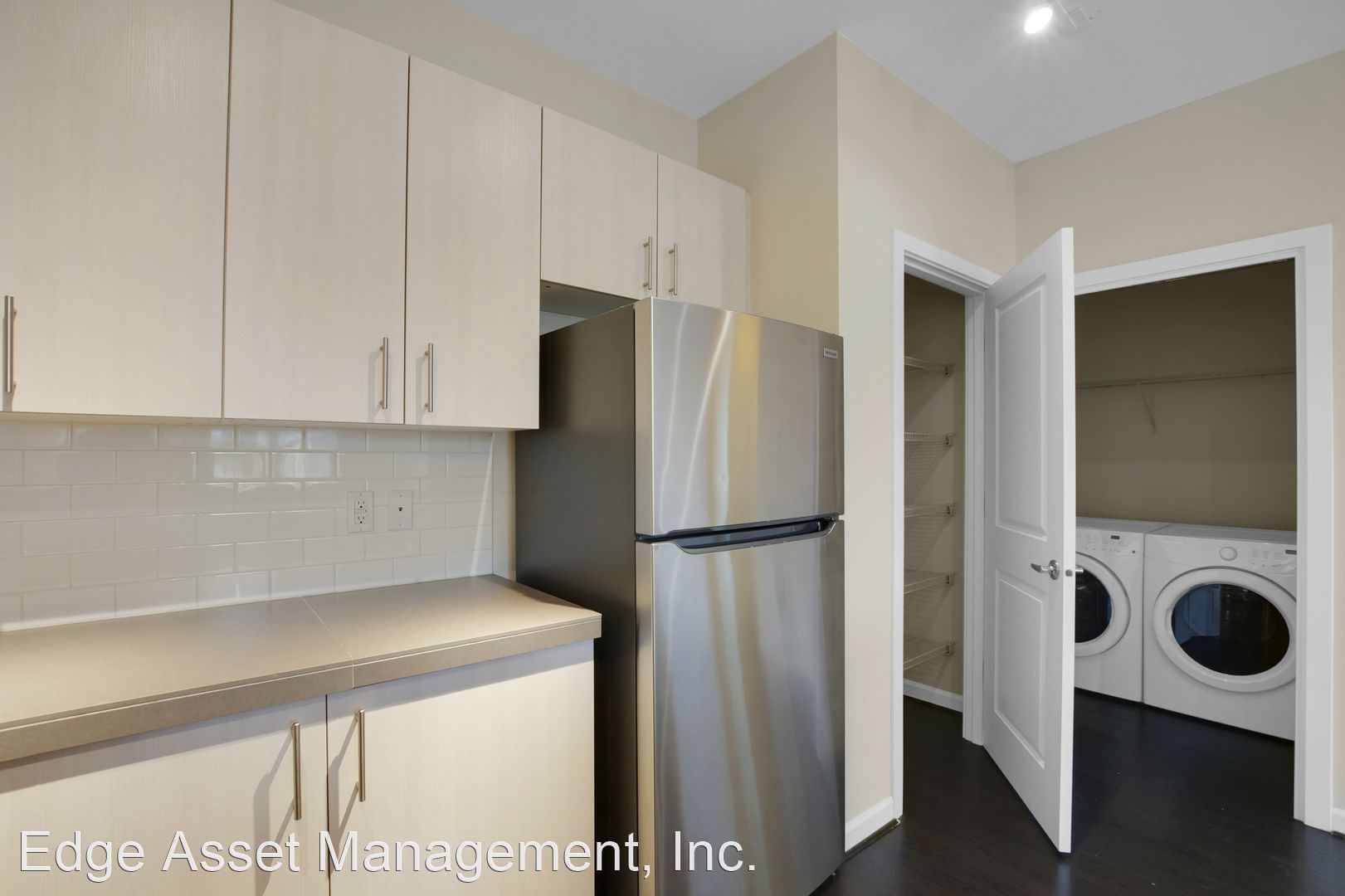 The Leaf's over-sized kitchen features modern European style cabinetry, abundant counter-top space with breakfast bar and upgraded stainless steel appliance package including glass flat top stove. The large pantry offers plenty of shelving for convenient additional storage, and the laundry room just steps away and features FULL-SIZED front loading washer/dryer.