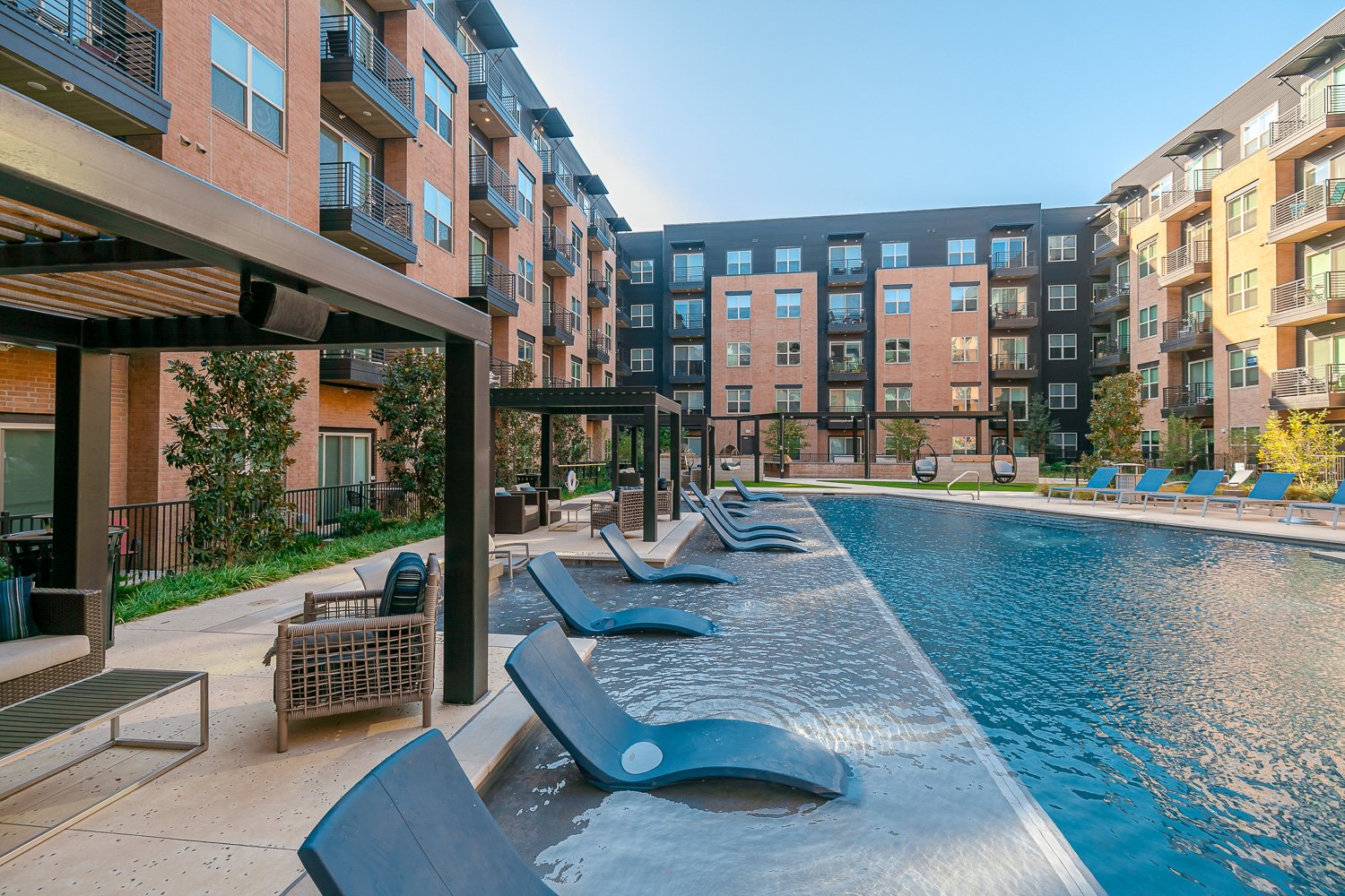 Los Altos Trinity Green Apartments in Dallas, Texas With thoughtful design and exclusive community amenities, Los Altos Trinity Green Apartments is your destination for upscale apartments in Dallas, Texas! We've redefined what luxury living means to you in our exceptional studio, one, two, and three-bedroom apartments, that offer up to 1,696 square feet of living space with a collection of interior touches. Come home to spacious living areas with nine or ten-foot ceilings, wood-inspired flooring, electronic lock entry, solar shades, walk-in closets, a private patio or balcony, washer/dryer in-unit, and a variety of other modern finishes. Our gourmet kitchens, featuring white quartz countertops, glass tile backsplashes, stainless steel appliances, apron-front kitchen sinks, and undercabinet lighting, will all have you cooking like a pro in no time! Beyond your apartment, you’ll find an array of resort-style amenities that focus on comfort and luxury. Take a dip in our refreshing swimm
